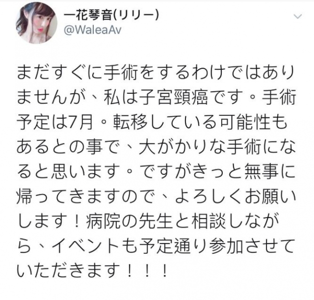 家 娛樂新聞 【繼麻美由真後】AV女優一... 娛樂新聞 【繼麻美由真後】AV女優一花琴音確診子宮頸癌 去年否認患愛滋 由 editor Facebook Twitter Pinterest WhatsApp 日本AV女優一花琴音,今日在Twitter透露患上子宮頸癌,她稱癌細胞有機會擴散,會安排7月入院做手術,會跟醫生商量是否能如期出席已接下的公開活動及工作,是繼麻美由真後,再有AV女優不幸確診子宮頸癌。 曾以寶生莉莉之名發展的一花琴音,去年10月在AV界驚爆愛滋風波時,突然衝出來證明自己沒有受到感染,隔兩個月更宣佈引退AV界,今年3月又話復出,而她向來神化,更曾在網上直播玩吞藥嚇壞粉絲。 (資料來源:網上截圖/連結) 閱讀全文 相關文章多從作者 程美段遇上選擇困難症 戰衣去深圳酒店散心 燈神馮盈盈心情靚出相曬線 粉絲睇錯以為係膠紙... 大台前小花陳潔玲池邊曬白滑靚背 想給粉絲一點寧靜... 熱門 最新文章 程美段遇上選擇困難症 戰衣去深圳酒店散心 燈神馮盈盈心情靚出相曬線 粉絲睇錯以為係膠紙? 大台前小花陳潔玲池邊曬白滑靚背 想給粉絲一點寧靜? 大台小花蘇可欣戀上旅行節奏 可愛扁嘴網友求正面相 大台小花蘇可欣戀上旅行節奏 可愛扁嘴網友求正面相