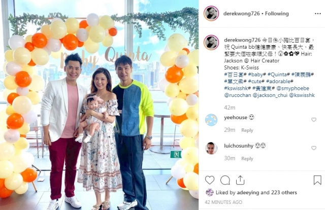陳展鵬與單文柔去年10月舉行婚禮後,今年4月榮升父母,單文柔為陳展鵬誕下七磅囡囡「小豬比」,並取名Quinta。原來夫婦二人今日七一為女擺百日宴,有份出席的黃建東於Instagram上載跟陳展鵬一家三口合照,留言說:「今日係小豬比百日宴,祝 Quinta bb健健康康、快高長大、最緊要大個咗孝順父母!」