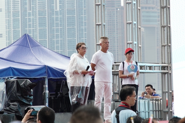 一直撐大灣區的歌手肥媽(Maria Codero)今日終於現身,與早前去警署撐警的陳百祥(阿叻)齊齊穿上大會呼籲的白tee冒雨出席活動,並擔任活動司儀。二人上台與前律政司司長梁愛詩、譚惠珠等同台講感受,肥媽在現場與出席人士一齊大叫口號:「守護香港!」更在台上激動斥責議員:「好心,你哋讀咁多書,唔好害人哋啲仔女啦!你自己個仔就叫佢走,害死人咩你哋。」