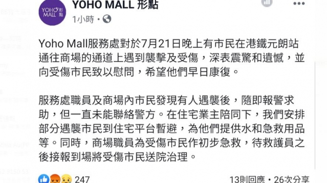 昨晚白衣暴徒血洗元朗西鐵站,與西鐵站相通的YOHO MALL,亦成戰場,YOHO MALL今日在其fb出帖,指YOHO MALL服務處對於昨晚有市民在港鐵元朗站通往商場的通道上遇到襲擊及受傷,深表震驚和遺憾,並向受傷市民致以慰問。