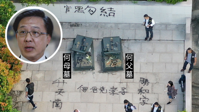 元朗前晚(21日)突變無警狀態,大批被視為黑幫的白衣人以武器無差別襲擊平民、記者和議員,卻獲警方優待「放生」。身為律師的新界西立法會議員何君堯,被拍到與白衣人握手,更為對方鼓掌和豎拇指,盛讚其為「英雄」,被質疑與襲擊有關。雖然何開記招,堅稱與襲擊無關,但不少人不信納何的辯解,到其議辦抗議。有連登仔轉載網上圖片,見到何君堯雙親墳墓被毀和塗鴉,傳媒取得空拍照片證實消息。警方其後到場拉起封鎖線,何傍晚到場視察並報警,形容是人神共憤。