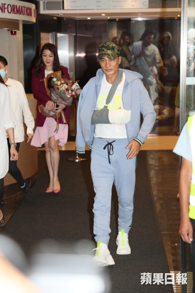記者祝福華哥早日康復,問佢痛唔痛?華哥表示:「有你哋嘅關心,我頂得住。」華哥右手被繃帶包實,要用護臂帶保護右手,腹部隱約見到貼上三塊紗布,華哥其後接受醫院代表獻花,他還禮貌用左手接着花束,華哥其後由Mani陪同上七人車離開。